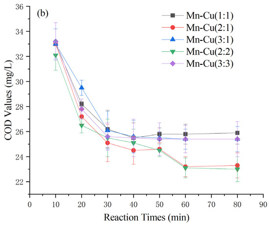 Effect of catalyst types on COD of Maotai-flavored Baijiu wastewater treated by heterogeneous Fenton-like reaction: (a) Mn-Fe type and Mn-Fe-Cu type; (b) Mn-Cu type.