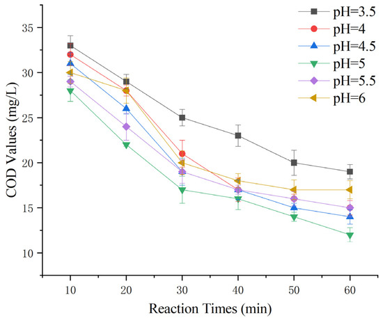 Figure 6 shows that as the pH changed from acidic to neutral, the ability of the heterogeneous Fenton-like process to remove COD from Maotai-flavored Baijiu wastewater initially increased and then decreased. The greatest COD removal was observed at an initial pH of 5.0. This suggests that a relatively neutral pH is more suitable for this reaction than for conventional Fenton reactions, reducing the need for strongly acidic conditions.