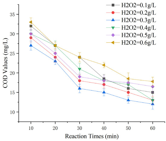 Observing from Figure 7, the COD-removal performance of Maotai-flavored Baijiu wastewater increased and then decreased with increasing H2O2 dosage. The treatment efficacy was strongest when the 3% H2O2 dosage was 0.3 g/L and decreased when the dosage exceeded or fell below this level. The analysis indicated that, similar to classical Fenton reactions, ·OH played a crucial role in determining the treatment efficacy. Lower H2O2 dosages resulted in insufficient ·OH, leading to inadequate oxidative strength, while higher dosages generated excessive ·OH, triggering a quenching reaction: Excessive ·OH converts Fe2+ to Fe3+, and ·OH further reacts with itself to produce H2O2 [33,34]. It is speculated that an excess of hydroxyl radicals could also lead to the conversion of Mn2+ to Mn3+. All of these can result in the ineffective decomposition of H2O2, which reduced the efficiency of the H2O2 reaction.