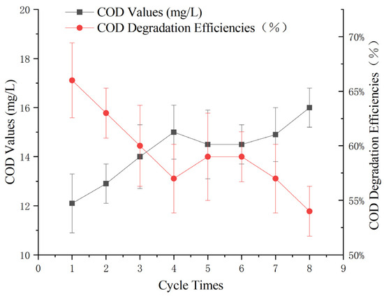 According to Figure 9, the treatment effect of the heterogeneous Fenton-like reaction gradually decreased with increasing number of cycles. However, the effluent COD remained at approximately 12 ± 1 mg/L within eight cycles. The results indicate that the catalyst exhibited good stability, supporting its potential application in the advanced treatment of Maotai-flavored Baijiu wastewater.