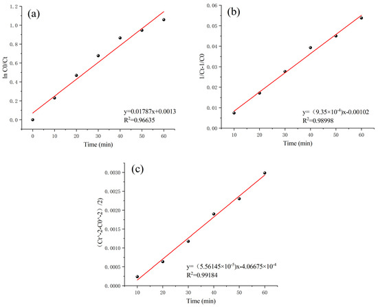 According to the above analyses, the best treatment effect of this heterogeneous Fenton-like reaction was obtained when the Mn-Fe/γ-Al2O3 (2:1 wt%) catalyst was used at pH 5.0, a catalyst dosage of 30 g (100 g water), a 3% H2O2 concentration of 0.3 g/L, and a reaction time of 60 min. The kinetics data were fitted with first-order (Equation (1)), second-order (Equation (2)), and third-order reaction kinetics equations (Equation (3)) to investigate the characteristics of this heterogeneous Fenton-like reaction for the removal of COD from Maotai-flavored Baijiu wastewater [38,39,40].