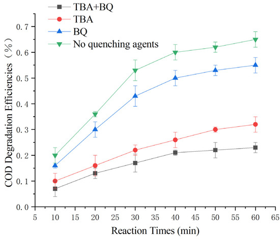 The experiments were conducted under the optimal reaction parameters with 10 mmol/L TBA and 10 mmol/L BQ. According to the results shown in Figure 11, the COD degradation rate was 66% without the addition of a quenching agent, 59 ± 3% with the addition of BQ, 32 ± 3% with the addition of TBA, and 25 ± 3% with the addition of both.