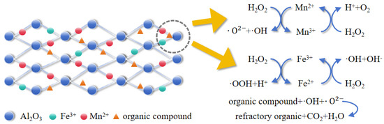 On the basis of the XPS and GC–MS results as well as the results of the free radical capture experiments, the mechanism of the heterogeneous Fenton-like reaction involving this catalyst is presumed to be as follows (The process is illustrated in Figure 12): first, pollutants are adsorbed onto the surface of the catalyst; second, Fe3+ precipitated on the active sites on the surface of the catalyst reacts with Mn2+ in the following two pathways [28]: First, Fe3+ and Mn2+ react with hydrogen peroxide to produce superoxide radicals, hydroxyl radicals, and superoxide anion radicals.