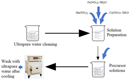 The preparation method is outlined in Figure 13. γ-Al2O3 was used as the carrier, and Mn(NO3)2, Fe(NO3)3·9H2O, and Cu(NO3)2·3H2O were used as the raw materials. The process involved washing 2~4 mm γ-Al2O3 with ultrapure water until the filtrate was clear, followed by calcination at 600 °C for 4 h in a muffle furnace with subsequent static cooling [23]. After cooling, 100 g of γ-Al2O3 was weighed into a beaker, soaked in ultrapure water for 12 h, and filtered, and the amount of absorbed water was calculated.