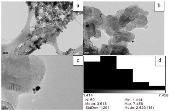 Figure 1 depicts TEM images of the Pt-MCM composite. Figure 1a,b clearly show the presence of nanoparticles dispersed across the MCM support. Figure 1c allows the size of a few nanoparticles to be determined to be 1–7 nm in diameter, with an average particle size of 3.51 nm in diameter. In comparison with Figure 1a, some variety in NP size can be seen, allowing the size of the NPs to be considered from 2 to 10 nm in general.