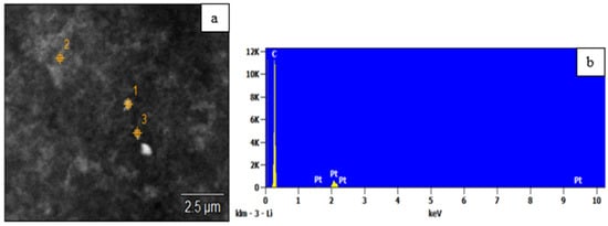 Platinum nanoparticles were chosen as the metal portion of the nanocomposite material in this study due to their superior catalytic properties. Platinum is renowned for its high catalytic activity, making it an essential component in various industrial applications [23,24,25]. One significant application of platinum is as a catalyst for the oxidation of methane. In this process, platinum facilitates the conversion of methane (CH4) into carbon dioxide (CO2) and water (H2O). This reaction is particularly important in natural gas processing and in efforts to mitigate methane, a potent greenhouse gas, from entering the atmosphere. The high efficiency of platinum in promoting this reaction makes it invaluable in environmental protection and energy industries. Platinum is also extensively used in the hydrosilylation reaction, a chemical process that involves the addition of silicon–hydrogen bonds to unsaturated organic compounds. This reaction is crucial in the production of silicones and other organosilicon materials, which are widely used in industries ranging from electronics to medical devices due to their stability and versatility. In the automotive industry, platinum’s role as a catalyst in catalytic converters is well established. Catalytic converters are critical components in vehicle exhaust systems designed to reduce harmful emissions. Platinum, along with other precious metals like palladium and rhodium, helps convert toxic gases such as carbon monoxide (CO), hydrocarbons (HC), and nitrogen oxides (NOx) into less harmful substances like carbon dioxide (CO2), water (H2O), and nitrogen (N2). This conversion is vital for meeting stringent emission standards and reducing the environmental impact of vehicles. The choice of platinum nanoparticles enhances these catalytic processes due to their increased surface area, which provides more active sites for reactions. This increased surface area significantly boosts the efficiency and effectiveness of platinum as a catalyst. Thus, incorporating platinum nanoparticles into a nanocomposite material leverages these benefits, making the material highly efficient for catalytic applications. This choice underscores the importance of platinum in advancing both traditional industrial processes and cutting-edge technologies, ensuring better performance, sustainability, and environmental protection. In the form of nanoparticles, platinum exhibits enhanced catalytic properties due to its increased surface area, which provides more active sites for reactions. This makes platinum nanoparticles particularly effective in several advanced catalytic applications. For instance, they are employed as catalysts for the hydrogenation of alkynes, a crucial reaction in the synthesis of various fine chemicals and pharmaceuticals. Furthermore, platinum nanoparticles are integral to the functioning of proton exchange membrane (PEM) fuel cells, where they catalyze the hydrogen oxidation reaction at the anode and the oxygen reduction reaction at the cathode, thus enabling efficient energy conversion in hydrogen fuel cells. Additionally, platinum nanoparticles are utilized in the oxygen evolution reaction (OER), a key reaction in electrochemical water splitting and renewable energy storage systems. The versatility and efficiency of platinum nanoparticles in these catalytic processes underscore their importance in both traditional and emerging technologies [23,24,25].