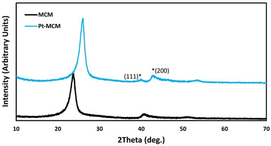 The XRD spectra of the catalyst are shown in Figure 3. A large peak indicative of the MCM backbone is seen in both the pure MCM and the Pt-MCM composite. The peaks between 20 °C and 30 °C are often seen in carbon-based materials due to graphitic characteristics. There is a shift in this peak after the incorporation of nanoparticles that has been previously reported in similar materials and can be attributed to a change in the lattice structure of the MCM material due to nanoparticles adhering to it [30]. Two peaks indicative of PtNPs can be seen at 39.9° and 42.8°, representing the (1 1 1) and (2 0 0) faces of the face-centered cubic (FCC) structured nanoparticles (ICDD PDF 70-2431) [31]. There are three other peaks associated with FCC structures that were not seen; however, this is most likely due to the limitations of the instrument that struggled to detect the small particles.