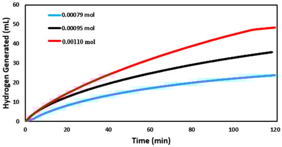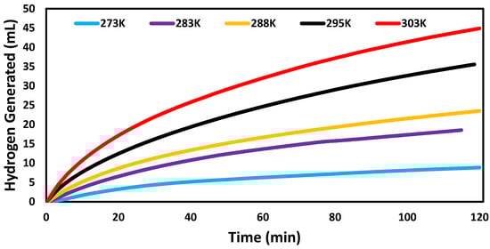 Several trends can be noticed by observing Figure 4, Figure 5 and Figure 6 that give information on optimal conditions for this hydrolysis reaction. It is clear that increasing the quantity of NaBH4 results in an increase in hydrogen generation rate (Figure 4). This was expected, as Le Chatelier’s principle states that increasing the quantity of a reactant will result in an increase in the quantity of the product (Equation (1)). As described above, when testing the pH of the reaction (Figure 5), it was observed that lowering the pH of the solution increased the reaction rate and the opposite was true for raising the pH. In one of the earliest studies on this reaction, the team of Schlesinger et al. (1953) stated that lowering the pH of this reaction results in an increase in the formation of the borate ions that then release hydrogen [34]. Another early study by the team of Kaufman et al. (1985) found that increasing the pH of this reaction has detrimental effects, possibly due to an increase viscosity of the reaction solution [33]. This temperature study (Figure 6) shows that heating the reaction is beneficial and cooling it is detrimental to the hydrogen generation rates. Based on Equation (1), this reaction must be endothermic in this case. All these results were consistent with the previous work of this team on this reaction [15,16,17,18,19].