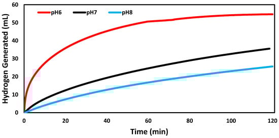 The pH of the reaction was adjusted to see how it would affect the catalyst, as seen in Figure 5. For comparison purposes, the quantity of NaBH4 was kept consistent at 0.00095 mol and temperature was kept at 295 K. Since the previous study already included trials tested at pH 7 and 0.00095 mol, this became the baseline for comparison. First, the pH of the reaction was lowered to pH 6, resulting in an increased hydrogen production over pH 7 and an average amount of generated hydrogen of 54.7 mL. When the pH of the reaction was raised to pH 8, the volume of produced hydrogen was reduced to 25.7 mL. As before, these volumes allowed for the hydrogen generation rates to be calculated at 0.0456 mL min−1 mg−1 and 0.0214 mL min−1 mg−1 for pH 6 and 7, respectively. These results are supported by previously reported studies. It has been observed that at higher pH levels, the increased concentration of OH− ions may compete for released hydrogen [32,33]. Conversely, the increased concentration of H+ ions in acidic solutions may facilitate the splitting of a hydrogen off water molecules [34].