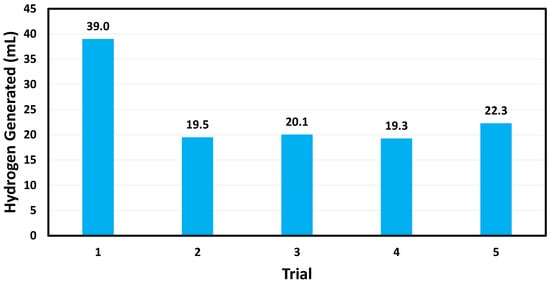 Five consecutive reusability trials were performed on the catalyst to evaluate its performance over multiple uses. The reaction conditions for these trials were standardized as follows: 0.00095 moles of sodium borohydride (NaBH4) were used, with the pH of the solution maintained at 7 and the reaction temperature kept constant at 295 K. As evident in Figure 8, there was a notable decline in the amount of hydrogen gas produced after the first trial. This decrease can be attributed to the reduction in catalyst activity over time. Several factors may have contributed to this decline, including surface changes due to the formation of BO2− (as described in Equation (1)) and structural changes to the catalyst. These changes reduced the number of active sites available for the hydrolysis reaction, resulting in lower hydrogen production. Additionally, the deposition of BO2 can alter the optimal ratio between a catalyst and its support material, further decreasing catalyst activity [44]. Following the initial drop in hydrogen production after the first trial, the amount of generated hydrogen gas began to stabilize. This stabilization was likely due to the aforementioned compensatory mechanisms coming into effect, maintaining a more consistent level of catalyst activity despite the initial loss. Over the subsequent trials, the catalyst produced an average volume of 20.3 mL of hydrogen gas, indicating that although there was an initial decline, the catalyst maintained a relatively stable performance in the later trials.