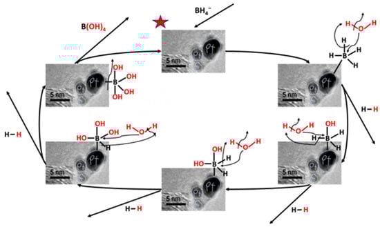 The proposed method of hydrogen generation in the hydrolysis of NaBH4 as catalyzed by Pt-MCM is depicted in Scheme 1. The reaction begins with a single borohydride ion (BH4−) attacking and fixing itself to a platinum nanoparticle on the MCM backbone. A nearby water molecule is attracted to the borohydride, attacking it and attaching itself. This causes a hydrogen from the borohydride to be forced off, which attacks a single hydrogen from the water molecule, splitting it off. This process causes a single H2 molecule to be produced, and a hydroxyl group is left in the place of the hydrogen on the borohydride. This process can happen three more times, after which the B(OH)4 molecule separates from the PtNP, allowing a new borohydride to replace it and the process to repeat. Each time the cycle completes, 4 H2 molecules are produced [45].