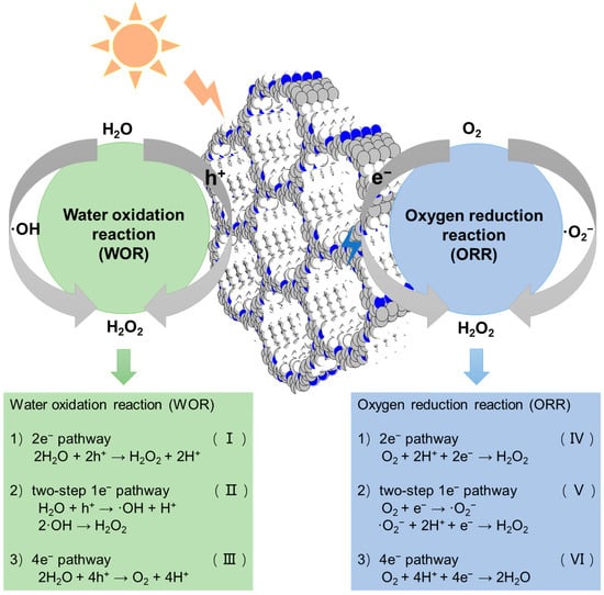 Schematic diagram of photocatalytic H2O2 synthesis mechanism and pathways of water oxidation and oxygen reduction reaction.