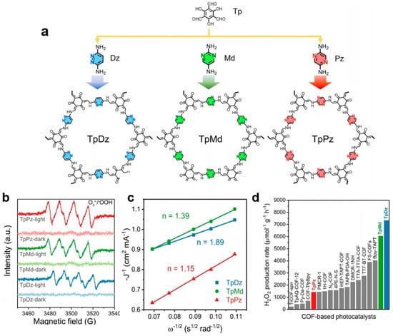 (a) Schematic chemical structures of DAzCOFs with different relative nitrogen positions; (b) EPR spectra of TpDz photocatalytic system after 5 min of dark and visible irradiation; (c) Koutecky–Levich plot acquired from RDE measurements; (d) Comparison of hydrogen peroxide production performance of DAzCOFs with other COF-based photocatalysts [30]. Copyright 2023 Wiley-VCH.