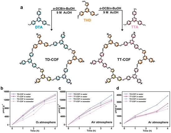 (a) Schematic diagram of the synthesis of TD-COF and TT-COF. Performance of TD-COF and TT-COF for photocatalytic production of hydrogen peroxide in water and seawater under (b) O2, (c) air, and (d) Ar atmospheres [33]. Copyright 2023 Wiley-VCH.