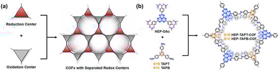 (a) Schematic diagram of the molecular engineering strategy for the photocatalytic hydrogen peroxide evolution of COFs with isolated redox centers. (b) Schematic route of synthesis of HEP-TAPT-COF and HEP-TAPB-COF [35]. Copyright 2022 Wiley-VCH.
