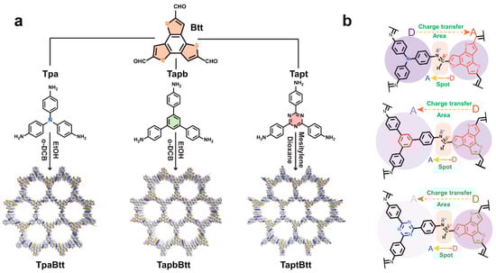 (a) Schematic route of synthesis of TpaBtt, TapbBtt, and TaptBtt. (b) Schematic illustrations of the direction of electron transfer between functional motifs and imine bonds in TpaBtt, TapbBtt, and TaptBtt. The yellow dashed line represents the motifs and the red dashed line represents the imine bond. Shades of color represent differences in energy [36]. Copyright 2023 Springer Nature.