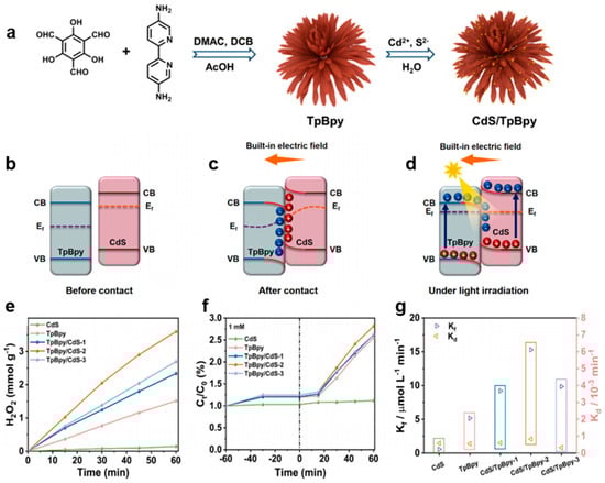 (a) Schematic route of CdS/TpBpy synthesis; (b–d) charge-transfer mechanism of CdS/TpBpy; (e) photocatalytic H2O2 synthesis of CdS, TpBpy, and CdS/TpBpy; (f,g) Kf and Kd values for photocatalytic H2O2 decomposition of CdS, TpBpy, and CdS/TpBpy [37]. Copyright 2023 Elsevier.