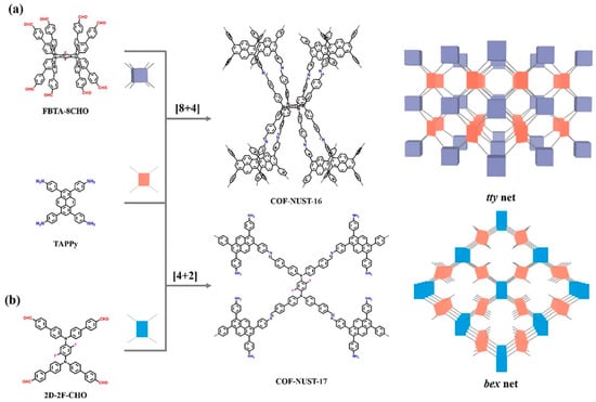 (a) Schematic synthetic routes of COF-NUST-16 with extended [8 + 4] Tty network and (b) COF-NUST-17 with extended [4 + 2] bex network. Different colors represent different building blocks, purple, orange, and blue represent FBTA-8CHO, TAPPy, and 2D-2F-CHO [38]. Copyright 2022 Elsevier.