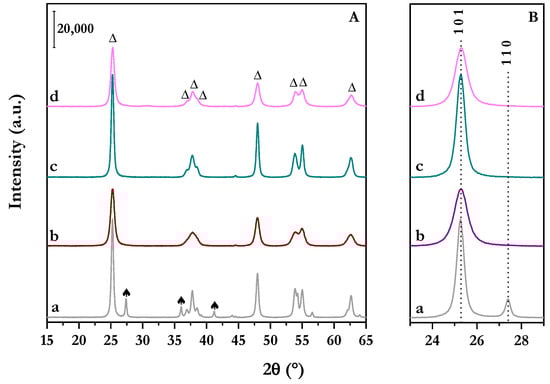 X-ray diffraction profiles of TiO2 supports (A) and their detailed region from 23° to 29° (B): Ti-AR (a), Ti-A-250 (b), Ti-A-500 (c), and Ti-M (d) (anatase (Δ) and rutile (♠)).