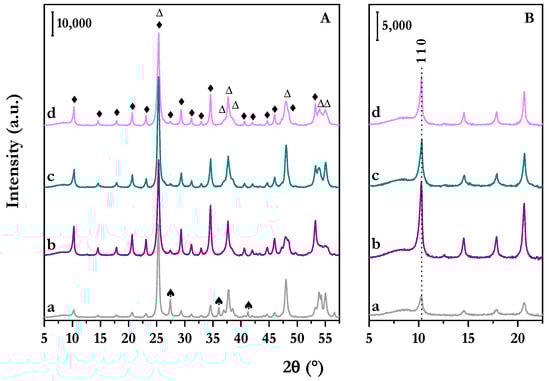 The 1H MAS-NMR spectrum of the HPW/Ti acid catalysts (Figure 5A) shows, in all cases, a broad signal between 4 and 11 ppm, which is composed of several signals centered at approximately 5.2, 7.3, and 8.3 ppm. The signal at 8.3 ppm is similar to that observed in the bulk HPW [32] and is related to the H+ protons of the HPW units interacting with water molecules, forming H+(H2O)2 clusters [30,32]. Meanwhile, the peak at 7.3 ppm may be associated with protons interacting with water molecules but with different coordination, probably H+(H2O)n clusters with an n > 6 [31,32,33,34]. The relative intensity of the main resonance peak at 7.3 ppm is significantly higher in the HPW/Ti-A-250 sample, which could be related to the higher water content in this sample [29,33,35]. The signal appearing in the HPW/Ti catalysts at 5.2 ppm is associated with adsorbed or coordinated water molecules on the TiO2 surface and/or the HPW units [31,34,36,37,38,39]. This signal is more intense in the HPW/Ti-M and HPW/Ti-A-500 samples. Additionally, the resonance peak centered at 2.5 ppm is attributed to relatively mobile physisorbed water [36,39], while the signals at a lower chemical shift (0.8 and 1.4 ppm) correspond to water molecules interacting with the OH− groups on the TiO2 surface [33,40]. The relative intensity of signals corresponding to the OH− groups of the TiO2 supports interacting with water compared to the signals of the HPW units in the HPW/Ti acid catalysts decreases in this order: HPW/Ti-AR > HPW/Ti-A-500 > HPW/Ti-M >> HPW/Ti-A-250. This trend suggests that, after the incorporation of the HPW units, the number of free OH− groups on the supports decreases according to this sequence.