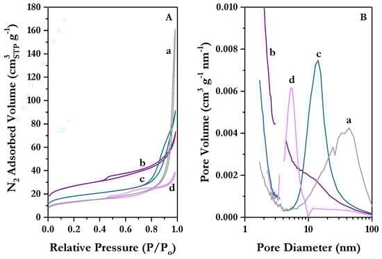 N2 adsorption–desorption isotherms (A) and pore size distribution (B) of HPW/Ti acid catalysts: HPW/Ti-AR (a), HPW/Ti-A-250 (b), HPW/Ti-A-500 (c), and HPW/Ti-M (d).