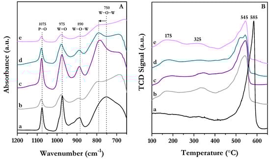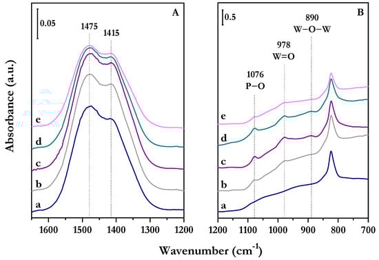FTIR-ATR spectra of the CZA catalyst (a) and the bifunctional CZA-HPW/Ti catalysts in the regions 1200–1650 cm−1 (A) and 700–1200 cm−1 (B): CZA-HPW/Ti-AR (b), CZA-HPW/Ti-A-250 (c), CZA-HPW/Ti-A-500 (d), and CZA-HPW/Ti-M (e).