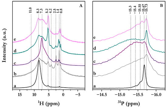 The 1H MAS-NMR spectrum of the reference bulk HPW (Figure 5A) exhibits a main signal centered at 8.3 ppm, which is associated with the highly acidic protons of the HPW units interacting via hydrogen bonding with water molecules [28,29,30]. The profile of the bulk HPW (Figure 5A) also displays a small signal at 5.2 ppm related to coordinated or adsorbed water molecules in the Keggin units [28,31]. The signal corresponding to the protons of hydrated HPW·6H2O units appears close to 8 ppm, indicative of moderate mobility and/or strong dipolar interactions.