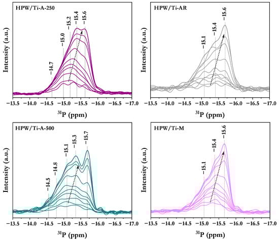 31P MAS-NMR longitudinal relaxation spectra of the HPW/Ti acid catalysts: HPW/Ti-A-250, HPW/Ti-A-500, HPW/Ti-AR, and HPW/Ti-M (Arrow on the graphs used to guide in the relative displacement of the signals).