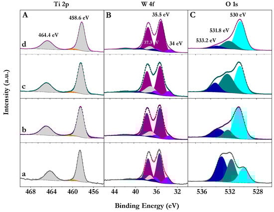 XPS spectra of the Ti 2p (A), W 4f (B) and O 1s (C) levels of HPW/Ti acid catalysts: HPW/Ti-AR (a), HPW/Ti-A-250 (b), HPW/Ti-A-500 (c), and HPW/Ti-M (d).