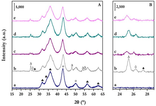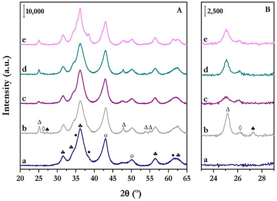 X-ray diffraction profiles of the CZA (a) and CZA-HPW/Ti bifunctional catalysts used in the reaction ((A) and (B) (detailed region from 23 to 29 °)): CZA-HPW/Ti-AR (b), CZA-HPW/Ti-A-250 (c), CZA-HPW/Ti-A-500 (d), and CZA-HPW/Ti-M (e) (anatase (Δ), rutile (♠), HPW (◊), ZnO (♣), CuO (●) and Cu0 (○)).