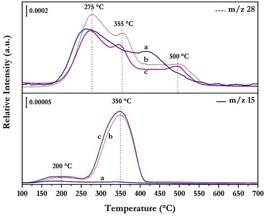 NH3 desorption and decomposition profiles (MS, m/z = 28 and m/z = 15) of the CZA catalyst (a) and reduced CZA-HPW/Ti bifunctional catalysts: CZA-HPW/Ti-AR (b) and CZA-HPW/Ti-A-250 (c).