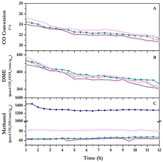 The bifunctional catalysts exhibit similar initial CO conversion values (≈24%, Figure 12A) and high initial DME production (>400 μmol DME/min gcat, Figure 12B). All the bifunctional CZA-HPW/Ti catalysts show only methanol, DME, CO2 and H2O production, without hydrocarbon formation from a possible dehydrogenation of the DME. The bifunctional catalysts present similar values of DME/methanol selectivity (Table 4), except the CZA-HPW/Ti-M sample, which presents a lower value of selectivity to DME. The correspondence between the DME/methanol ratio and the acidity of the bifunctional catalysts is well-established in acid catalysts based on heteropolyacids [4]. Therefore, the DME/methanol ratio obtained is consistent with the similar acidity observed for the bifunctional catalysts. All the bifunctional CZA-HPW/Ti catalysts show deactivation, as a decrease in CO conversion is observed with the reaction time (Figure 12A and Table 4). The deactivation is similar for all the catalysts. In addition to the deactivation in CO conversion, a slight decrease in DME/methanol selectivity with the time in reaction is also observed (Table 4), but of a lesser magnitude. The parallelism between the evolution of CO conversion and DME production, without a significant increase in methanol production, indicates that the deactivation observed in the bifunctional catalysts is mainly related to an evolution of the CZA catalyst under reaction conditions (Cu and/or ZnO sintering, Cu oxidation, etc. [63,64,65].
