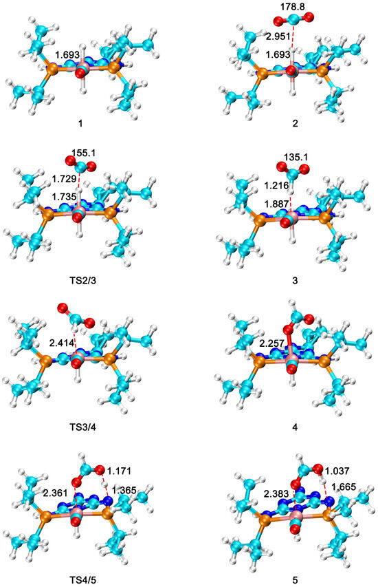 The optimized geometries of all species in CO2 hydrogenation to formic acid catalyzed by the Ru(II)–PN5P complex. The R1 groups in TS4/5 and complex 5 are omitted for clarity. The bond distances are in angstrom (Å), and the bond angles are in degrees (◦). (Ru: pink; C: cyan; P: orange; O: red; N: blue; H: white).