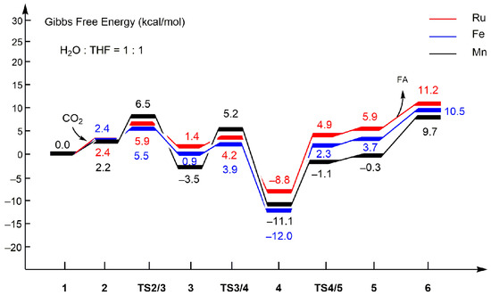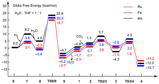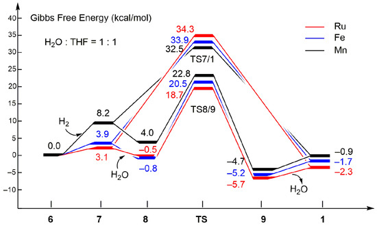 All calculations were performed with the Gaussian 09 program [45]. Geometry optimization and frequency analyses were carried out using the B3LYP hybrid functional [46]. To obtain more accurate single-point energy, the B3LYP–D3(BJ) functional with dispersion corrections was further applied [47]. For Ru, Fe, and Mn, the Stuttgart–Dresden pseudopotential basis set (SDD) was employed, which was supplemented by two sets of f functions and a set of g functions [48]. And the Dunning cc–pVDZ [49] basis set was applied for the other main group elements. Frequency analyses were performed to determine the minimum or transition state at each stationary point and to obtain the thermochemical properties of all species. Gibbs free energy was calculated at 298.15 K and 1 atm. All transition states were verified by intrinsic reaction coordinate (IRC) calculations. In order to keep in accord with the experimental conditions, we modeled the mixed solvent (H2O:THF = 1:1) in this paper. To deal with the solvent effects of the mixed solution (H2O:THF = 1:1), the polarizable continuum model (PCM) [50,51] was applied by defining the static dielectric constants (eps = 42.8905) and the dynamic dielectric constant (epsinf = 1.875937) of the solvent, respectively. All structural plots in this paper were drawn using VMD software (version 1.9.2, 29 December 2014) [52].