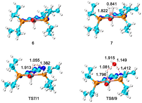 The optimized geometries of selected species in the regeneration of the Ru(II)–PN5P complex. The R1 groups in the TS7/1 and TS8/9 are omitted for clarity. The distances are angstrom (Å) (Ru: pink; C: cyan; P: orange; O: red; N: blue; H: white).