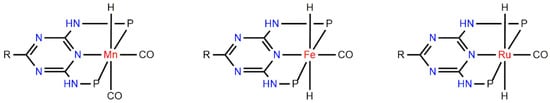 Mn(I)–PN5P, Fe(II)–PN5P, and Ru(II)–PN5P complexes considered in this work (P = PiPr2; R = NH–C3H5).