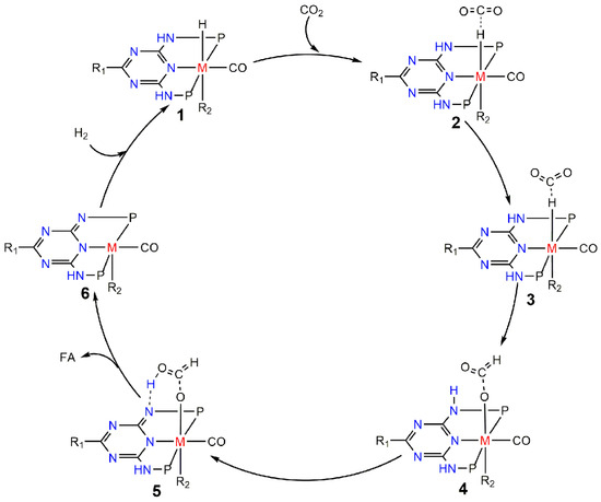 Proposed mechanism for CO2 hydrogenation to formic acid (P = PiPr2, R1 = NH–C3H5; M = Ru, Fe, R2 = H; M = Mn, R2 = CO).