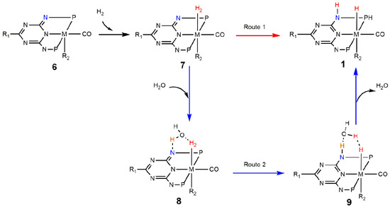 The regeneration of catalysts can proceed down two primary routes: (1) direct H2 cleavage after its coordination on complex 6, which is actually a process of proton transfer; (2) water molecules in solution can accelerate the process as a bridge for proton transfer, as shown in Scheme 3. Firstly, H2 is bound to the metal center in complex 6 to form complex 7. Then, H2 is broken on complex 7 to regenerate complex 1 by direct cleavage (route 1). Route 2 shows the cleavage of H2 with the help of a water bridge. The optimized geometries of selected species in the regeneration process on the Ru(II)–PN5P complex are illustrated in Figure 3. The optimized geometries of selected species on the Fe(II)–PN5P and Mn(I)–PN5P complexes during the regeneration process are given in Figures S3 and S4.