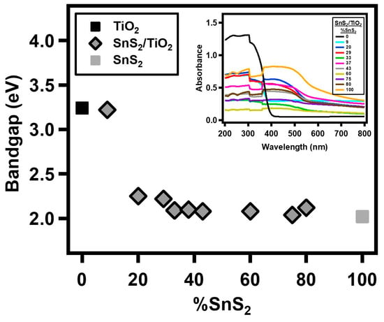The absorbance of the composites was measured by UV–vis differential reflectance spectroscopy (DRS), as shown in the inset of Figure 2. The optical bandgap of the composites was determined using the Kubelka–Munk function (Figure S2), and the results are shown as a plot as a function of %SnS2 in Figure 2. The measured band gap of the TiO2 nanosheets agreed well with the value in the literature (3.2 eV) for the anatase TiO2 with an absorption edge at around 400 nm [21]. SnS2 has an absorption edge of around 560 nm, which corresponds to a bandgap of 2.02 eV [14]. For the composites, the bandgap rapidly decreased from 3.2 eV as the %SnS2 increased to 20%. At a higher %SnS2, it slowly approaches that of SnS2 (2.02 eV). This agrees well with the presence of the SnS2 phase in the composites and the absorption by SnS2 in the visible region with increasing %SnS2.