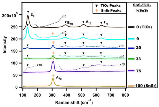 Figure 5 shows the Raman spectra of the as-synthesized SnS2/TiO2 composites in comparison with those of TiO2 and SnS2. The characteristic modes of the anatase TiO2 (Eg, B1g, A1g, and Eg) and that of the SnS2 phase (A1g) can be identified from the spectra [14,29,30,31], which confirms the presence of the anatase TiO2 and SnS2 phases in the composites and the relative intensity ratios of the two phases vary according to the SnS2 ratio. With increasing %SnS2, the intensity of Eg for anatase TiO2 decreases, while that of the A1g mode for SnS2 increases. The Raman spectra of all the composites are shown in Figure S7.