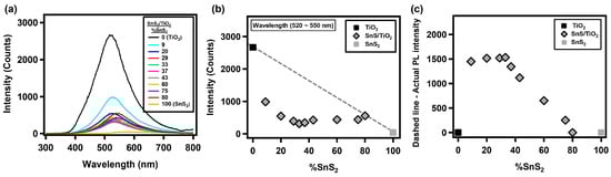 (a) PL spectra for SnS2/TiO2 composites with the excitation of a 325 nm laser, (b) the plot of maximum PL intensities at wavelengths of 520–550 nm as a function of % SnS2, and (c) the plot of the difference between the dashed line (Figure 6b) and the actual emission.
