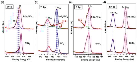 XPS was employed to further interrogate the chemical bonding states in the composites. The survey spectra (Figure S8) confirm the presence of elements O, Ti, S, and Sn in the composites. The core level spectra of O 1s in Figure 7a indicate the presence of two oxygen components at 529.7 and 531.5 eV, respectively, for TiO2, which can be assigned to lattice oxygens with direct Ti–O bonds and surface oxygen atoms in the forms of OH, respectively [32]. For the SnS2/TiO2 composite, the same oxygen components are observed at 530.6 and 532.4 eV, respectively, which are shifted towards higher binding energies compared to those of TiO2. The Ti 2p core-level spectra in Figure 7b show Ti 2p3/2 and Ti 2p1/2 features at 458.6 and 464.3 eV, respectively, for TiO2 nanosheets. The Ti 2p3/2 peak at 458.6 eV is indicative of the Ti4+ chemical state of stoichiometric TiO2 [33]. The binding energies of the Ti 2p core level for SnS2/TiO2 also appear at 459.3 and 465.0 eV, respectively, which are shifted towards higher binding energies. Detailed fitting results of the composites further disclose the presence of an additional small Ti 2p3/2 component at lower binding energies of 456.6 eV. This may be due to Ti species with a direct Ti–S bond at the heterojunction between SnS2 and TiO2 [34,35]. The formation of a direct Ti–S bond at the interface can also be seen in the S 2p core-level spectra in Figure 7, which reveals a small S 2p component at the binding energies of 162.4 and 163.6 eV with the spin-orbit splitting of 1.18 eV [34,35] in addition to the major component assigned to S2− of SnS2 at 161.5 and 162.7 eV (S 2p3/2 and S 2p1/2, respectively) for SnS2/TiO2. For the case of SnS2, the binding energies of S2− are shown to appear at 161.8 eV and 162.9 eV for S 2p3/2 and S 2p1/2, respectively. Therefore, the binding energies of the sulfur component for SnS2/TiO2 are shifted towards lower binding energies than those for SnS2. This may be the result of the heterojunction formation between SnS2 and TiO2 and the resulting downward (upward) shift of the electronic bands of TiO2 (SnS2) through an electron migration between TiO2 and SnS2 in the heterojunction [33]. Sn 3d core-level spectra in Figure 7d reveal the characteristics of Sn 3d3/2 and Sn 3d5/2 features at 486.7 and 495.2 eV, respectively, for SnS2 and SnS2/TiO2, which are assigned to Sn4+ of SnS2. No distinct shift in the Sn 3d features between SnS2 and SnS2/TiO2 can be attributed to the small shift for SnS2 and the broad nature of the Sn 3d. In addition, the broad Sn 3d spectral shape of the SnS2/TiO2 may suggest a possible contribution of Sn–O bonding even though it is not resolved. Overall, the XPS results further indicate the heterojunction formation between SnS2 and TiO2 nanosheets with the formation of a direct Ti–S bond, which can be beneficial for the efficient charge transfer at the heterojunction for improvement in photoactivity.