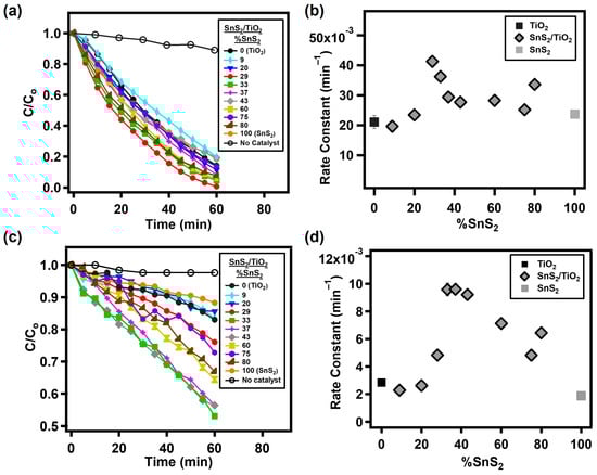 Photodegradation rates are shown as plots of C/Co vs. irradiation time for (a) MB and (c) RhB, along with initial rate constants vs. %SnS2 in the composites for (b) MB and (d) RhB.