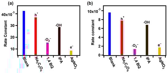 Comparison of rate constants with the use of trapping agents for (a) MB (SnS2/TiO2 29%) and (b) RhB (SnS2/TiO2 33%).