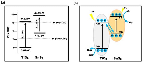 Energy diagram of the valence band (VB) and conduction band (CB) of the SnS2/TiO2 composite and a plausible mechanism for the charge separation and the generation of radical species. (a) Band alignment diagram for the SnS2/TiO2 and (b) Proposed charge separation mechanism at the heterojunction via Z-scheme. The energy levels for the CB (ECB) and the VB (EVB) can be calculated following Equations (S1) and (S2) listed in the Supplementary Materials.