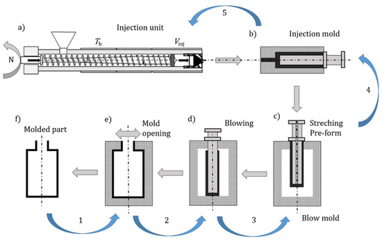 Optimization of injection stretch blow-molding. (a–f) illustrate the process steps. Straight arrows follow the process sequence; curved arrows follow the optimization sequence. N—screw speed, Tb—barrel temperature profile, Vinj—injection volume. Reprinted with permission from Ref. [159], copyright MDPI.