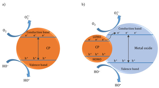 The scheme of photocatalysis, based on a (a) conducting polymer (CP) nanocomposite and (b) conducting polymer–metal oxide hybrid modification. Reprinted and adjusted with permission from Ref. [192], copyright MDPI.