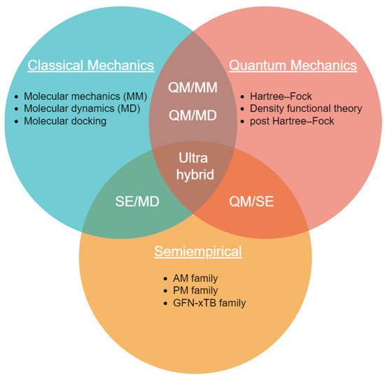 Over the years, a vast array of methods has been developed for performing calculations on molecules. Nevertheless, three distinct directions of development have emerged, each with its own set of advantages and disadvantages. These methods often intersect and complement each other, forming a comprehensive toolkit for molecular simulations. Their relationships are illustrated in the Venn diagram presented in Figure 4.