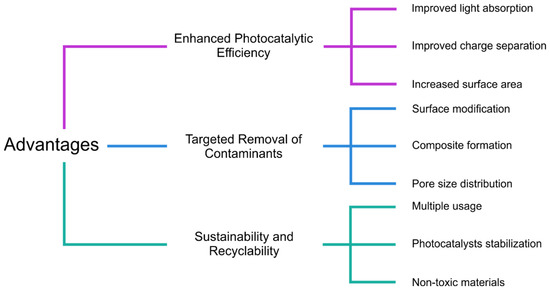 Photocatalysis by semiconductors has been recognized as one of the most acceptable, sustainable, and eco-friendly techniques to mitigate increasing pollution of the environment [64]. However, commercialization of these advanced technologies is challenging due to the poor activity of pure semiconductor photoactive material, charge recombination, and light absorption only in the ultraviolet region of the solar spectrum [65,66]. Evolution in the materials science area has led to the use of various polymers as adequate support for semi-conductor photocatalysts, providing solutions for the challenges mentioned above [67,68]. This might be attributed to the very low recombination of photogenerated charge carriers (electron–holes, e−–h+), which possess a long carrier lifetime due to the heavy adsorption of semiconductor nanocrystals onto polymer support [69]. The introduction of a polymer barrier band can increase photocatalysts’ response to visible light owing to the narrow band gap, and they can also act as effective scavengers of photo-generated holes [70].