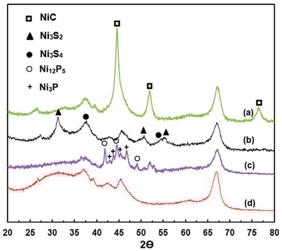 The XRD patterns of (a) NiC, (b) NiS, (c) NiP, and (d) γ-Al2O3. Reproduced with permission, Ref. [45].